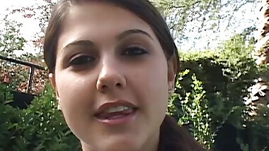 "Dude plows cute brunette with perky tits in yard"
