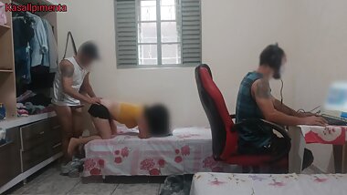 "Girlfriend rubs her friend's cock with her pussy while sitting on it"