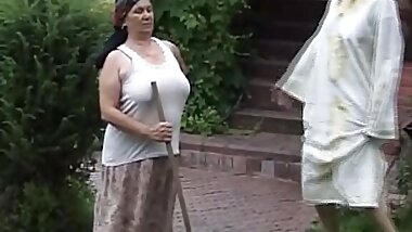 "A sexy German granny and teen getting their holes smashed by three cocks"