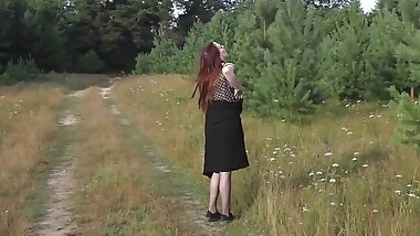"Lustful brunette undresses in the woods and walks naked"